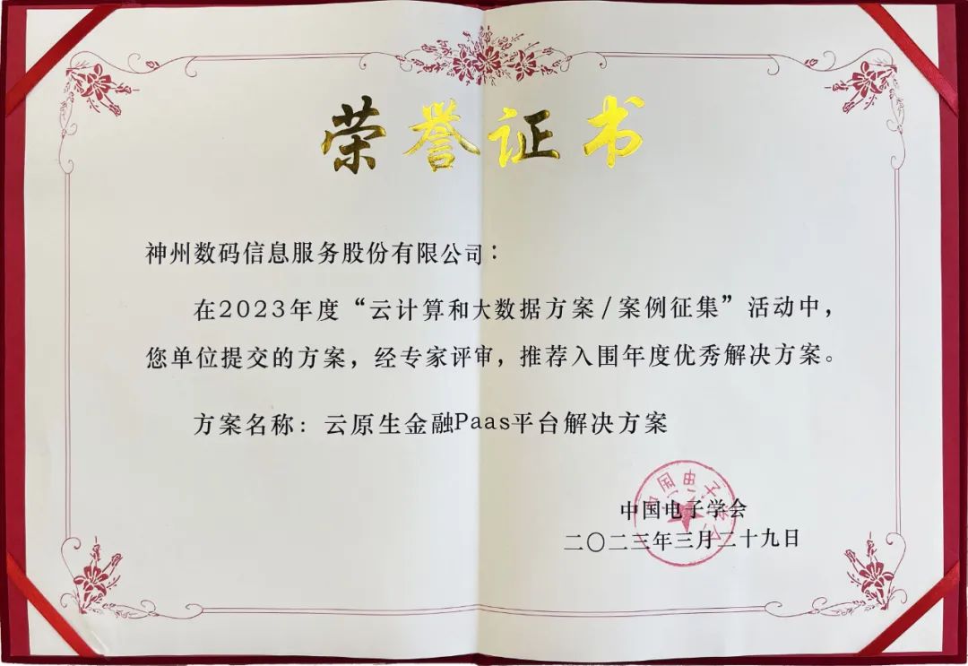 近日,由中国电子学会主办的“2023第二届中国云计算和大数据技术与应用大会”在北京顺利召开。会上,神州信息凭借云原生金融PaaS平台解决方案,入围年度优秀解决方案。
